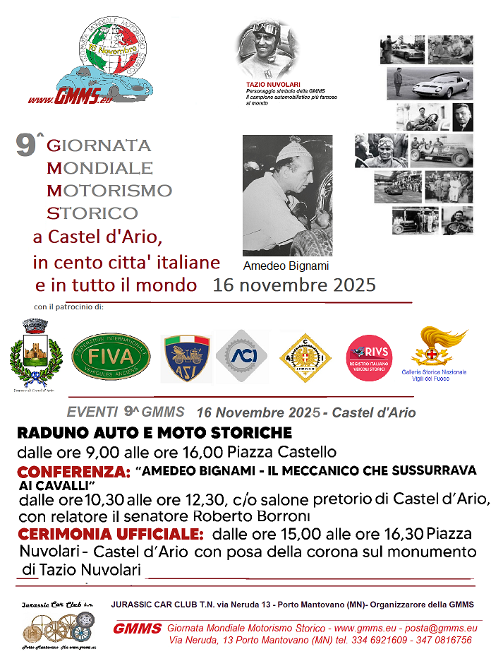 Il convegno, che si terra’ a Castel d’Ario , domenica 16.11.2025 a partire dalle ore 10,30 presso il salone pretorio del castello, avra’ per relatori anche il giornalista Attilio Facconi , per quanto attiene ai collegamenti di Bignami con Tazio Nuvolari ed il signor Ambrogio Pollastro , Conservatore del Museo Achille Varzi, per quanto concerne i fittissimi rapporti professionali e personali che Bignami intrattenne con il campione di argentino. Ora che il programma della 9^ GMMS e’ completamente definito e delineato, il C.O. e’ alacremente impegnato nella sua realizzazione.